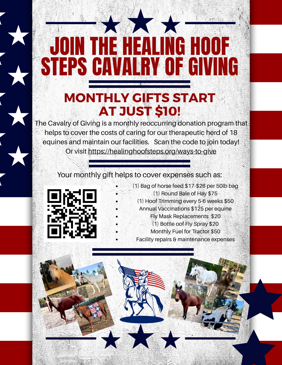 Join the Cavalry of Giving — our monthly giving program — and become a vital part of their care and comfort all year round. Your recurring donation helps feed, protect, and support these equine heroes and maintain the facilities they call home.