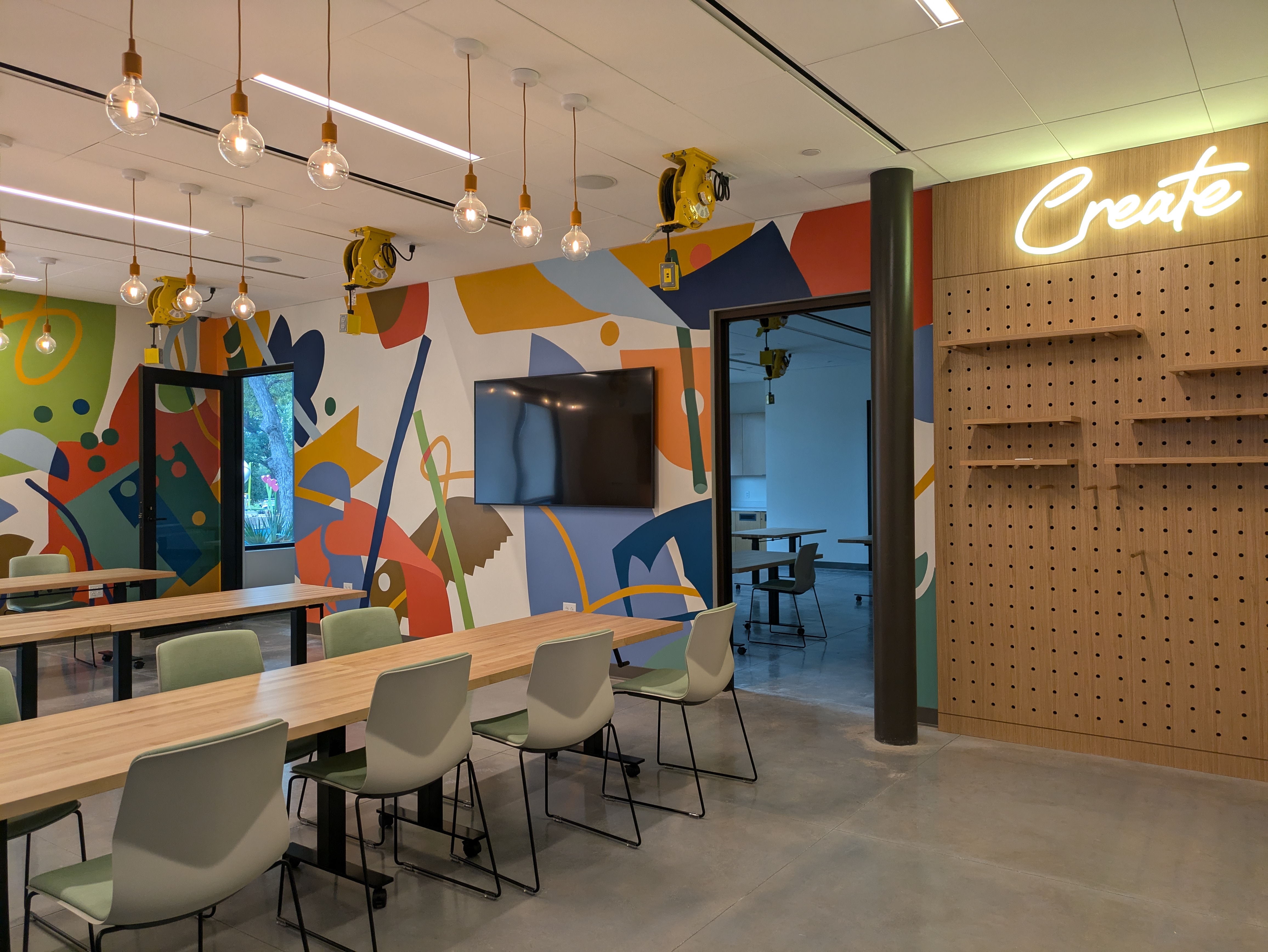 Featuring a vibrant abstract mural by The Art Mines, this space inspires creativity and connection through hands-on exploration and artistic expression.