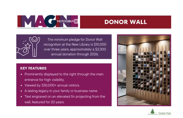 - Community recognition: Be celebrated as a supporter of the new Cedar Park Public Library, a cherished community institution.