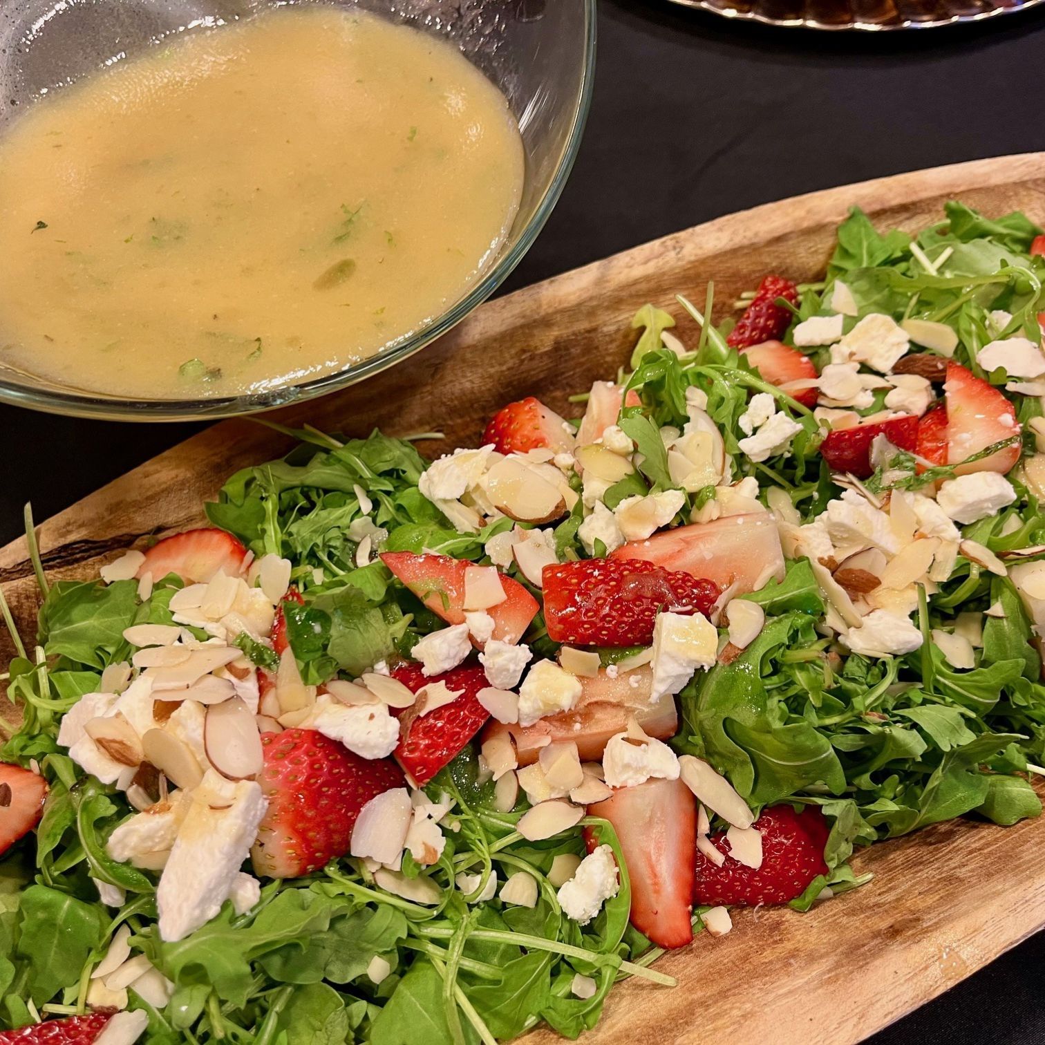 - ARUGULA-STRAWBERRY SALAD WITH FETA, HONEY ALMONDS,