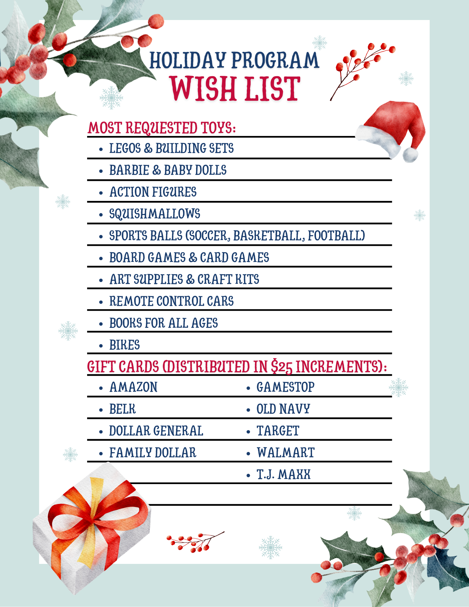 A suggested toy and gift card list is available at tboutreach.com/holiday-program.