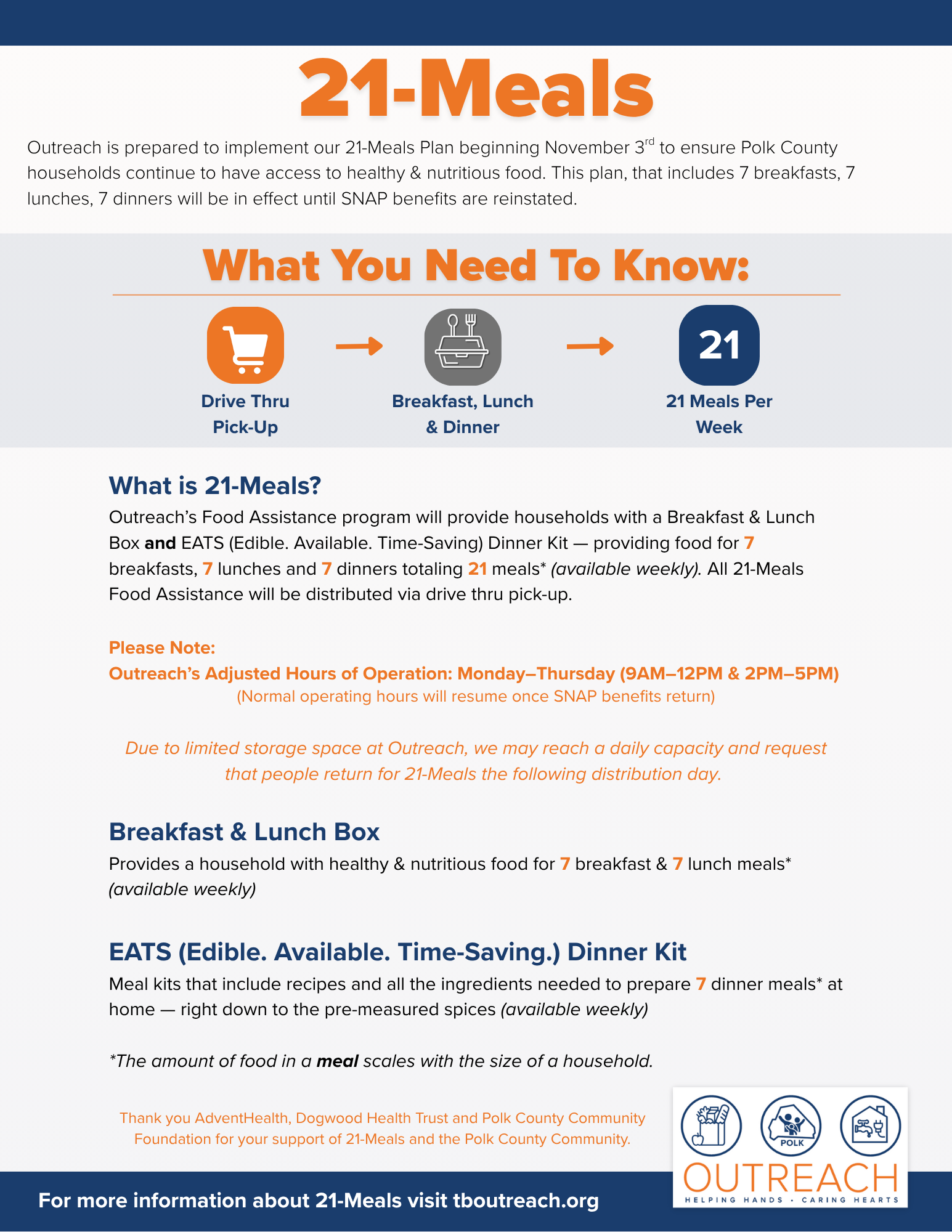 In response to Supplemental Nutrition Assistance Program (SNAP) benefits being suspended due to the government shutdown — Outreach has developed the 21-Meals contingency plan to ensure Polk County households continue to have access to 21 meals each week.