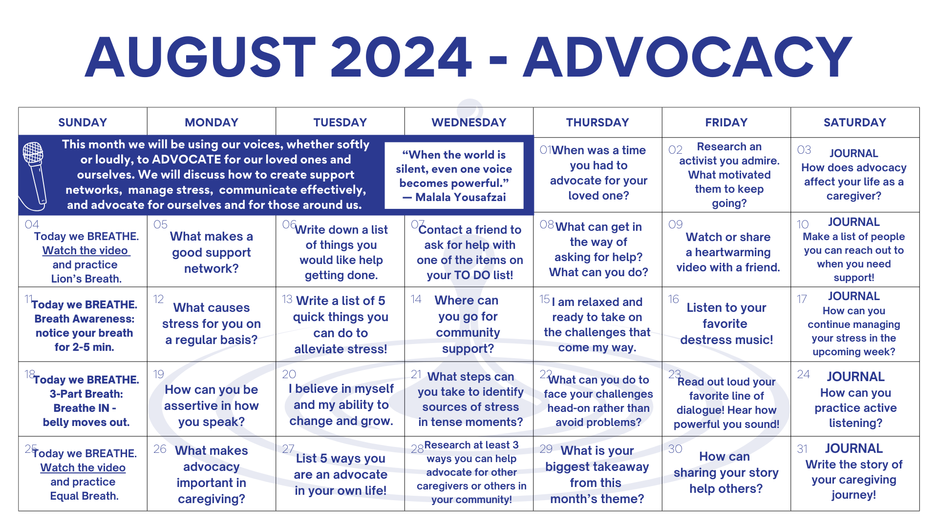 August's theme is ADVOCACY, which is defined by the Missouri Foundation for Health as “any action that speaks in favor of, recommends, argues for a cause, supports or defends, or pleads on behalf of others.” For the first half of the year, we focused much on finding ourselves. Now, in August, we will use the self-reflective skills we have built in order to create support networks, manage stress, and communicate effectively. With micro-goals, it’s easier to take the next right step - as Chinese philosopher Lao Tzu said, “A journey of a thousand miles, begins with a single step.” Check out August's Micro-Challenges Calendar here.