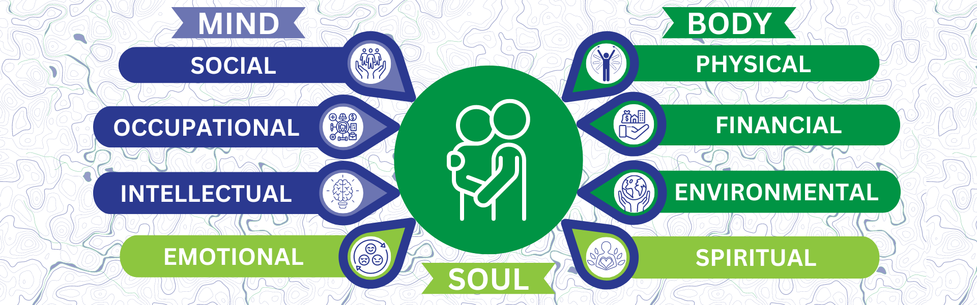 There are 8 dimensions of wellness. If we think of wellness as a journey towards the healthiest, best version of ourselves - focused on our mind, body, and soul, we can embark knowing that, as caregivers, when we're healthy, we provide better care to those we love.