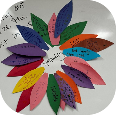 Our first cohort of families completed the program in January, culminating in a heartwarming graduation ceremony where families created a "Spirituality Word Flower," symbolizing their sources of strength. Each youth and caregiver wrote what helps them keep going during challenging times on a flower petal and added the petal to the group’s flower. Caregivers and youth identified things like faith, hope, love, family, connection, being in nature, and serving others.